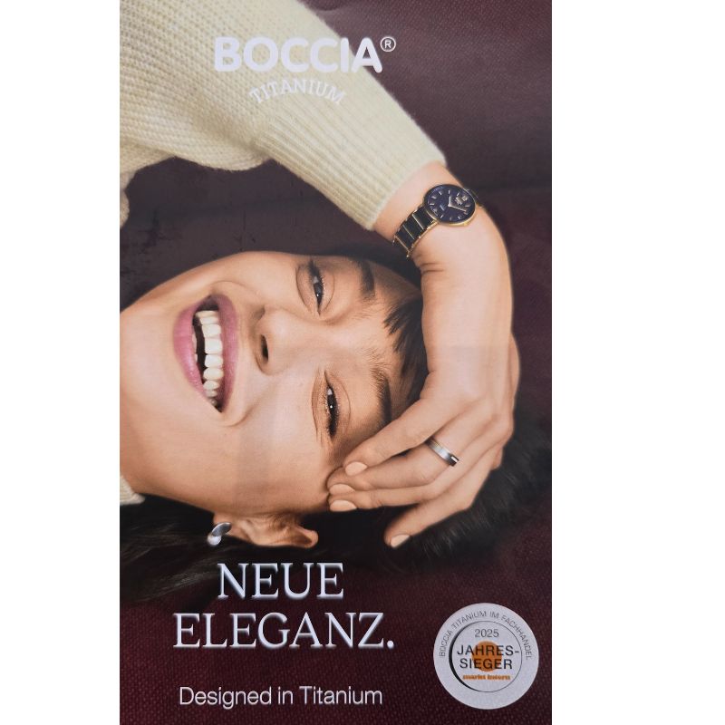 BOCCIA Titanium Damenuhr steht für technische Kompetenz und höchste Qualität. Titan ist härter als Edelstahl, aber deutlich leichter. Daher überzeugt es durch Stabilität und Tragekomfort. Das präzise Quarzwerk gewährleistet eine exakte Zeitmessung ohne Aufwand. Zudem wird jede Uhr sorgfältig geprüft, bevor sie die Produktion verlässt. Die Marke erhielt mehrfach Auszeichnungen für Service, Stil und Substanz im Fachhandel. Diese Werte spürt man in jedem Detail dieser Uhr – von der Form bis zur Funktion.