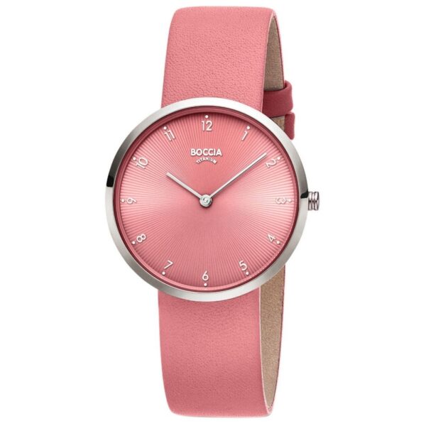 Die BOCCIA Titanium Damenuhr 3309-13 Pink kombiniert modernes Design und hochwertige Technik. Ihr Look ist elegant, frisch und feminin zugleich. Das Gehäuse besteht aus reinem Titan, das besonders leicht und widerstandsfähig ist. Deshalb trägt sich die Uhr angenehm und hautfreundlich. Außerdem ist Titan hypoallergen, korrosionsbeständig und recycelbar. Das pinke Zifferblatt sorgt für eine charmante Ausstrahlung, während das farblich passende Lederarmband Stil und Komfort vereint. Diese Uhr verbindet Modebewusstsein und Funktionalität auf natürliche Weise.