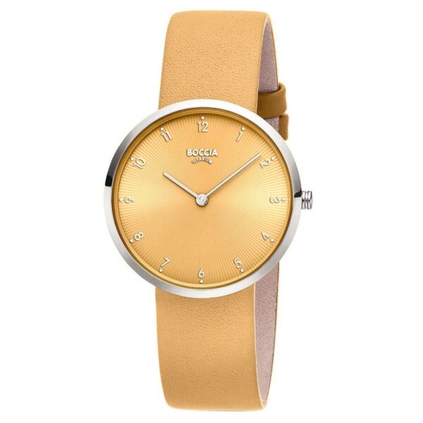 Die BOCCIA Titanium Damenuhr 3309-15 Gelb vereint stilvolle Leichtigkeit und technische Qualität in perfekter Harmonie. Ihr Design wirkt frisch, modern und zugleich elegant. Das leuchtend gelbe Zifferblatt zieht sofort die Blicke auf sich. Es erinnert an Sonnenlicht und verleiht jedem Outfit eine fröhliche Note. Das Gehäuse aus reinem Titan ist besonders leicht, robust und hautfreundlich. Außerdem ist Titan hypoallergen, korrosionsbeständig und antimagnetisch. Dadurch trägt sich die Uhr angenehm, auch bei empfindlicher Haut. Ihr geringes Gewicht sorgt zusätzlich für unvergleichlichen Tragekomfort – ideal für den ganzen Tag.