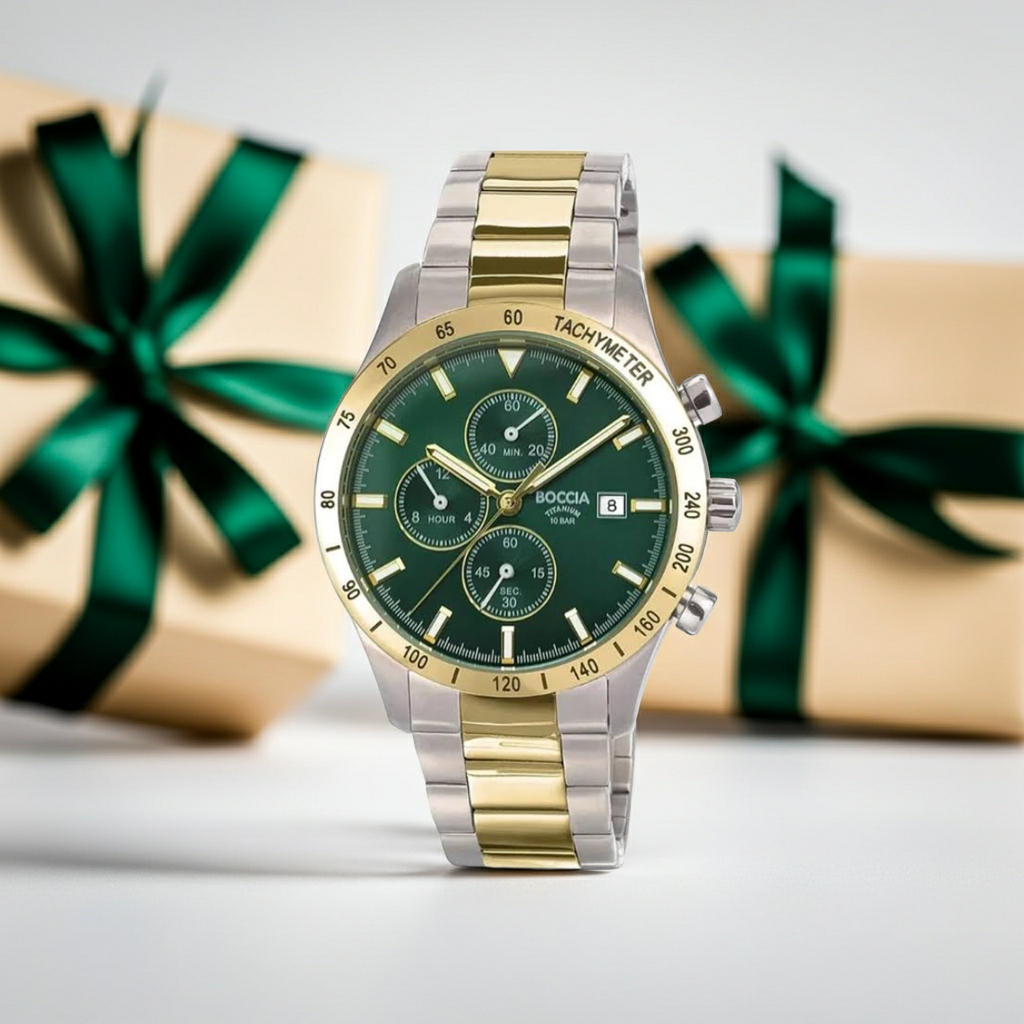 Die BOCCIA Titanium Herrenuhr 3739-05 Chronograph Bicolor zeigt eine ruhige Form und einen klaren Stil. Das Gehäuse aus reinem Titan wirkt leicht und glatt. Titan hat viele gute Eigenschaften. Es ist hart, rostfrei und freundlich zur Haut. Es reizt die Haut nicht und bleibt lange schön. Die Uhr hat einen edlen Ton, da Silber und Gold sanft zusammen wirken. Diese Mischung passt sowohl zu Freizeit als auch zu Arbeit. Sie wirkt ruhig, aber dennoch fein. Außerdem bringt das grüne Zifferblatt Tiefe und ein klares Bild für die Zeit. Die Zeiger sind gut zu sehen und leicht zu lesen.