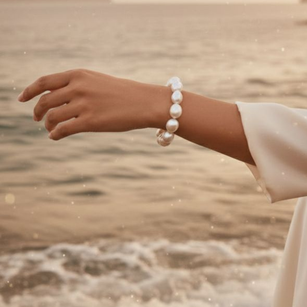 Das Perlenarmband „Meeressymphonie” feiert die Harmonie des Meeres und strahlt eine ruhige, klare Eleganz aus. Dabei zeigt jede Barock Süßwasserzuchtperle ihre eigene Form, und zugleich reflektiert jede das Licht auf besondere Weise. So entsteht ein lebendiger Rhythmus, der an sanfte Wellen im Abendlicht erinnert. Die Perlen schmiegen sich weich an das Handgelenk und außerdem geben sie jedem Moment einen warmen, natürlichen Akzent. Dadurch entfaltet das Armband eine feine Poesie, die sofort berührt.