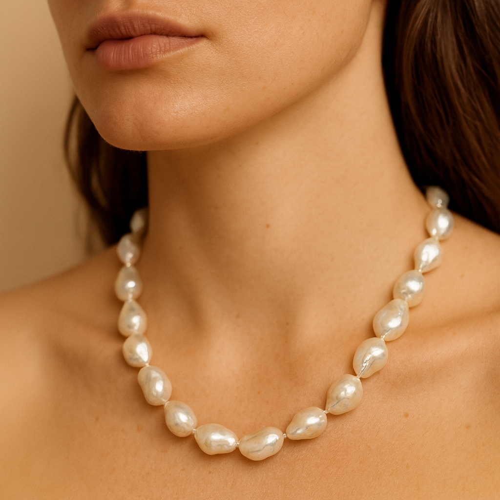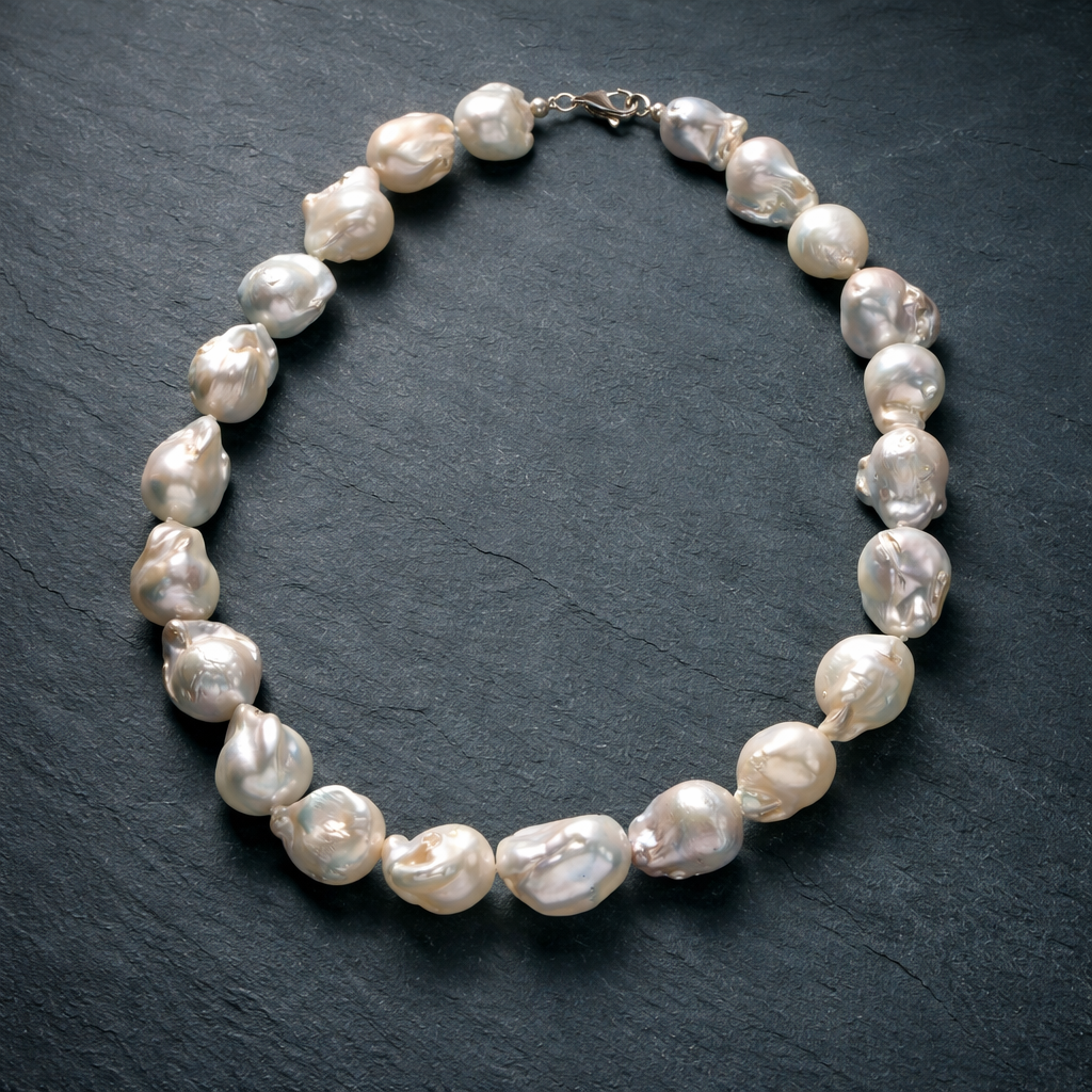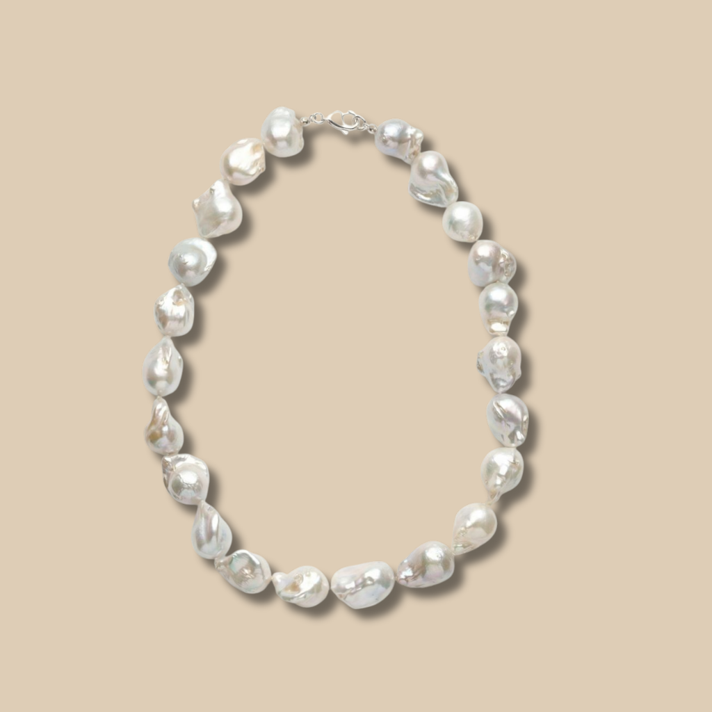 Die Perlenkette Silber „Meeressymphonie” zeigt Perlen von 15 bis 25 Millimetern. Jede Perle ist ein Unikat. Barock Süßwasserzuchtperlen entstehen ohne formende Schablonen, sodass sie frei wachsen können. Sie zeichnen sich durch organische Linien aus und tragen Spuren ihrer natürlichen Herkunft. Viele Menschen wählen Barockperlen, weil sie Individualität schätzen. Zudem wirkt jede Perle wie ein kleiner Tropfen aus Licht und Wasser und passt sowohl zu schlichten als auch zu eleganten Outfits. Die natürlichen Farbnuancen betonen jeden Look und verleihen ihm einen warmen, zarten Glanz. Dadurch entsteht ein Schmuckstück voller Charakter und Ausdruck.