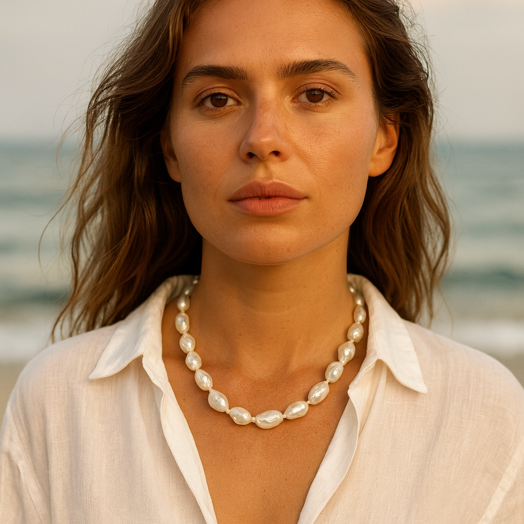 Die Perlenkette Silber „Meeressymphonie” trägt einen sanften Schimmer und erinnert an ruhige Meerlinien. Jede Barock Süßwasserzuchtperle zeigt ihre eigene Form und wirkt dadurch lebendig. Barockperlen haben keine perfekte Rundung, und genau das macht ihren Charme aus. Sie tragen kleine Wellen, feine Kanten und weiche Übergänge. Jede Perle bewegt das Licht anders und schenkt jedem Look eine natürliche Tiefe. Die Länge der Kette beträgt 49 Zentimeter, deshalb fällt sie harmonisch auf das Dekolleté. So entsteht Schmuck mit ruhiger Eleganz und maritimer Poesie.