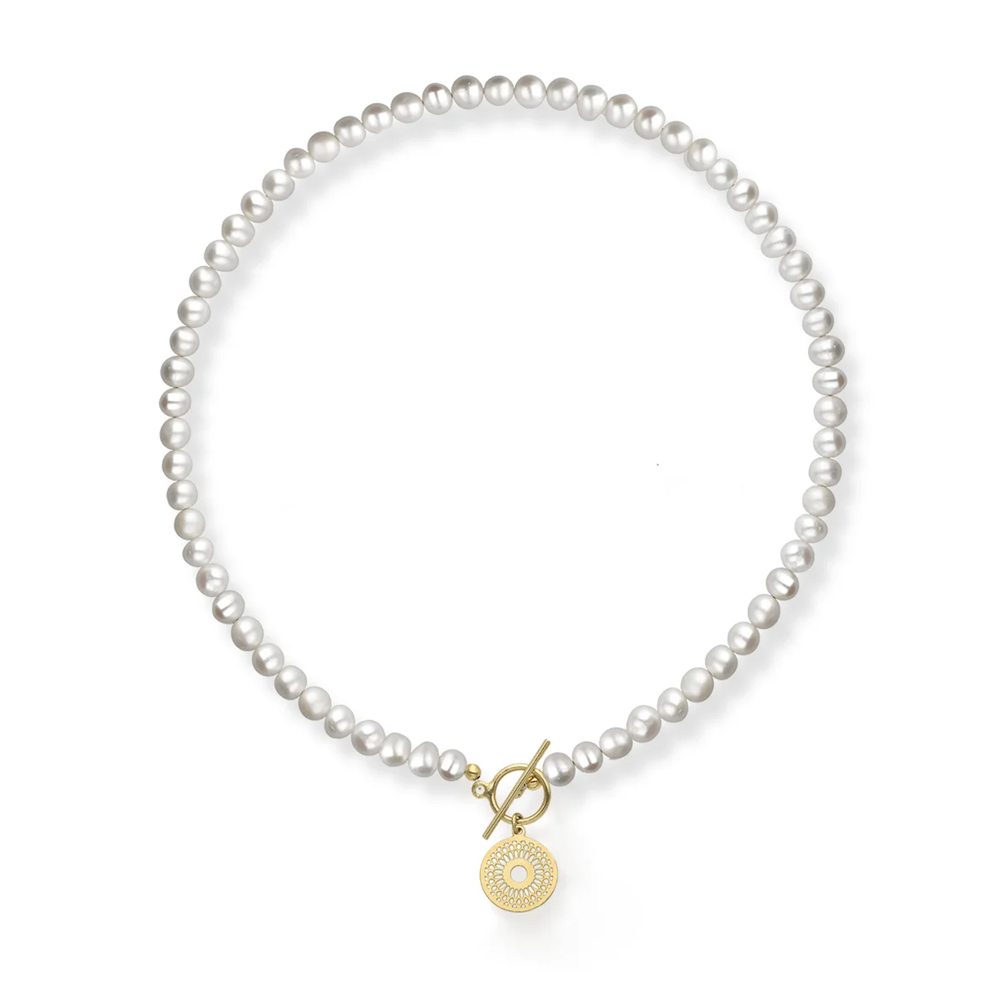 Die Perlenkette Silber Vergoldet „Mandala” passt zu klaren Outfits, und zugleich verleiht sie ihnen Tiefe. So entsteht Schmuck mit Bedeutung und Stil. Das Mandala stammt aus alten Kulturen und steht für Einheit und Harmonie. Deshalb wirkt es zeitlos und modern zugleich. In dieser Kette bildet es das Herzstück. Außerdem ergänzt das warme Gold den sanften Glanz der Perlen perfekt. Gleichzeitig setzt der dekorative Toggle-Verschluss einen modernen Akzent und ist auch praktisch. Dadurch lässt sich die Kette leicht anlegen und sicher tragen.