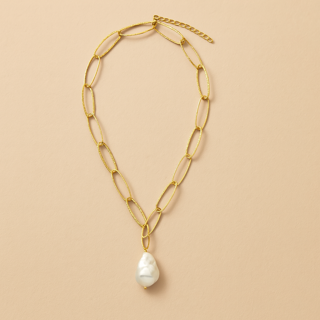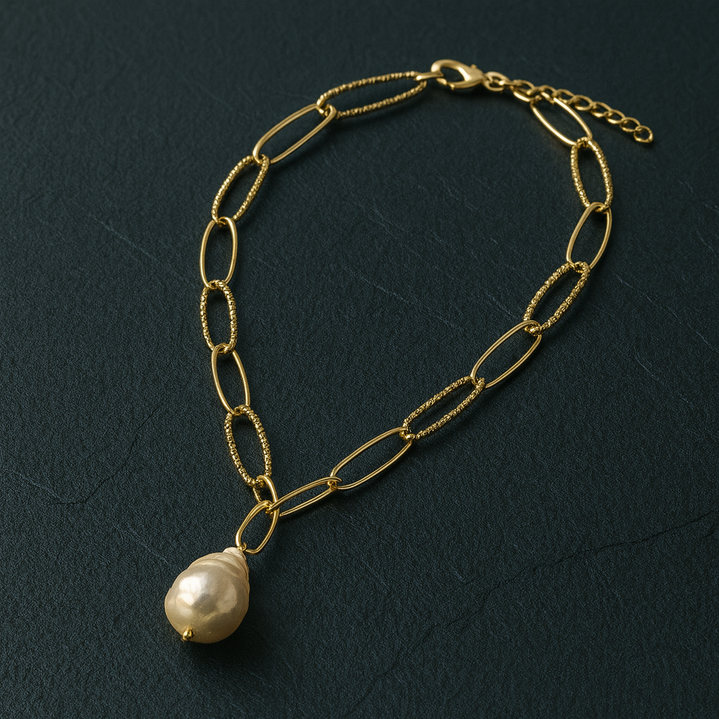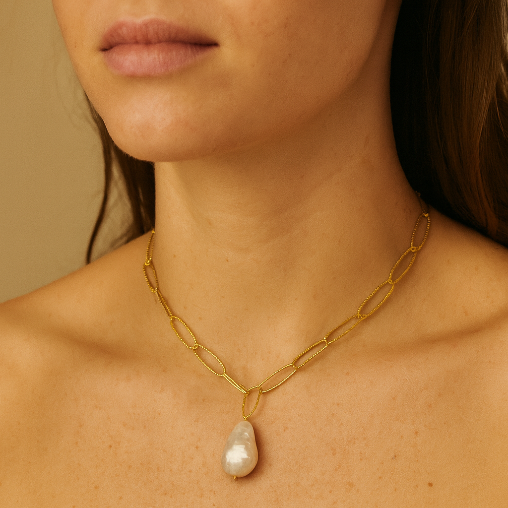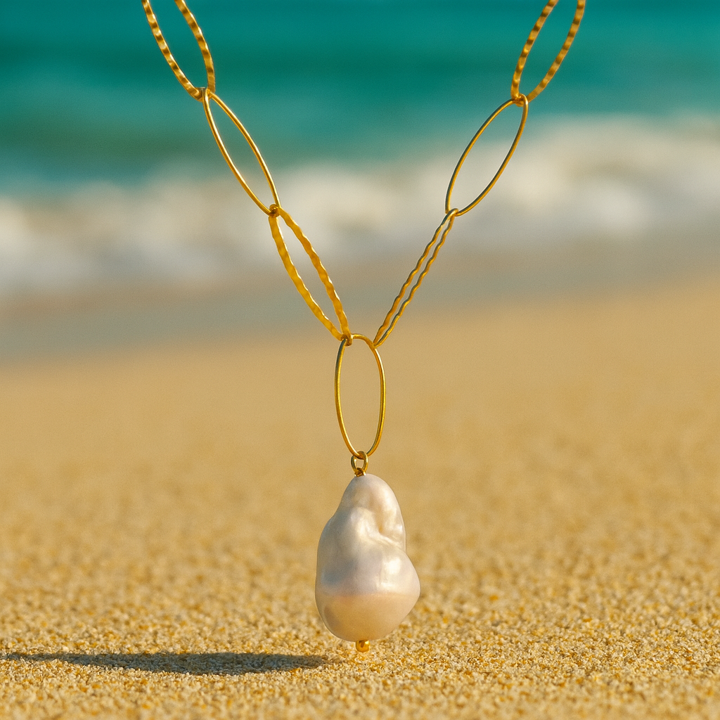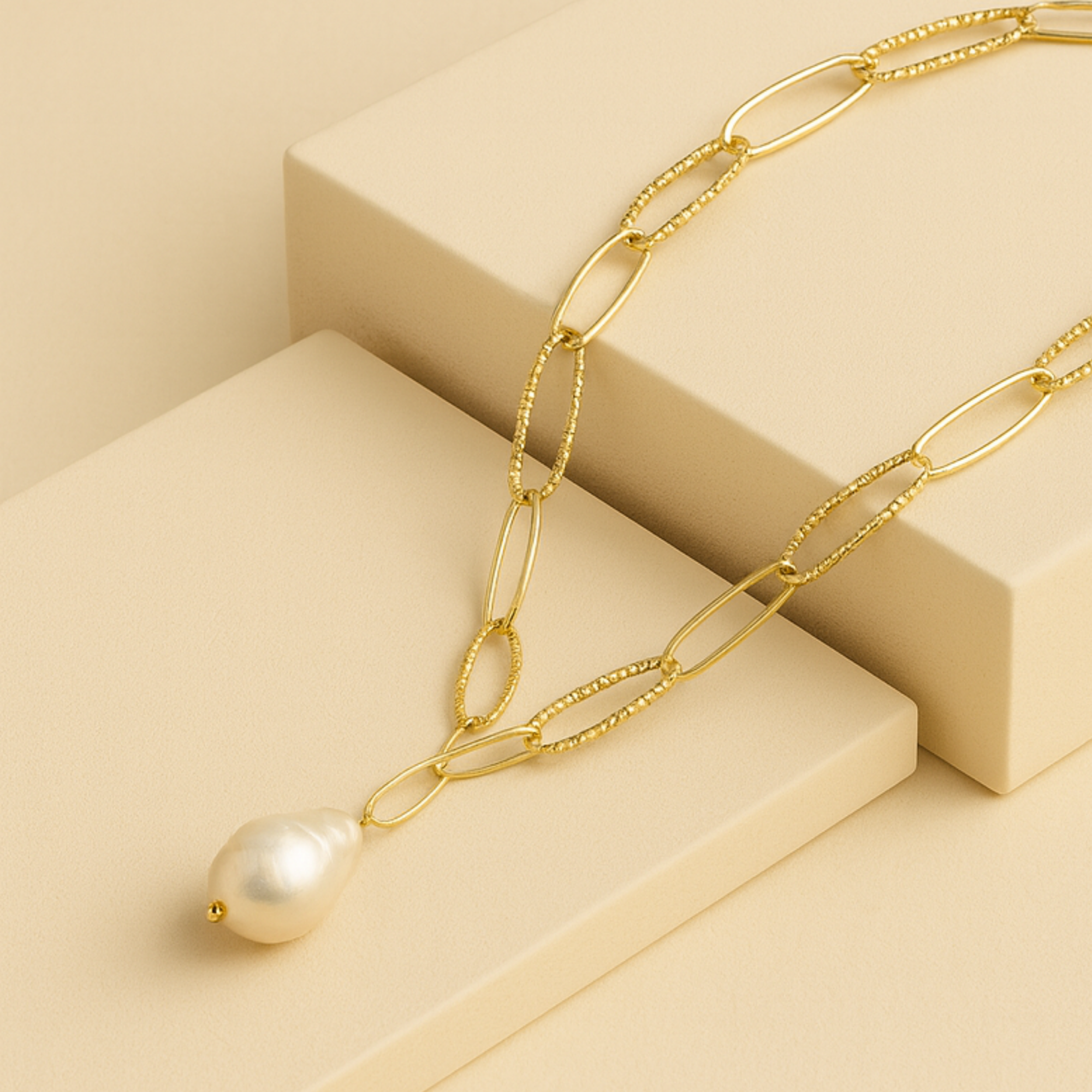 Die Perlenkette Silber Vergoldet „Meeresrauschen” eignet sich für Alltag, Business und Feiern. Sie liegt leicht am Hals und betont den natürlichen Stil ihrer Trägerin. Die organisch geformte Gliederkette zeigt kleine Bewegungen und bleibt stabil. Der Federring-Verschluss hält sicher und lässt sich leicht öffnen. Zudem harmoniert das Design perfekt mit anderen Perlenstücken, die Sie in unserem breiten Sortiment finden können. Die Kette wirkt sanft und dennoch ausdrucksvoll – ideal für Frauen, die Natur, Gold und schlichte Eleganz lieben. Schauen Sie sich auch die elegante Perlenkette Silber „Meeresrauschen” an.