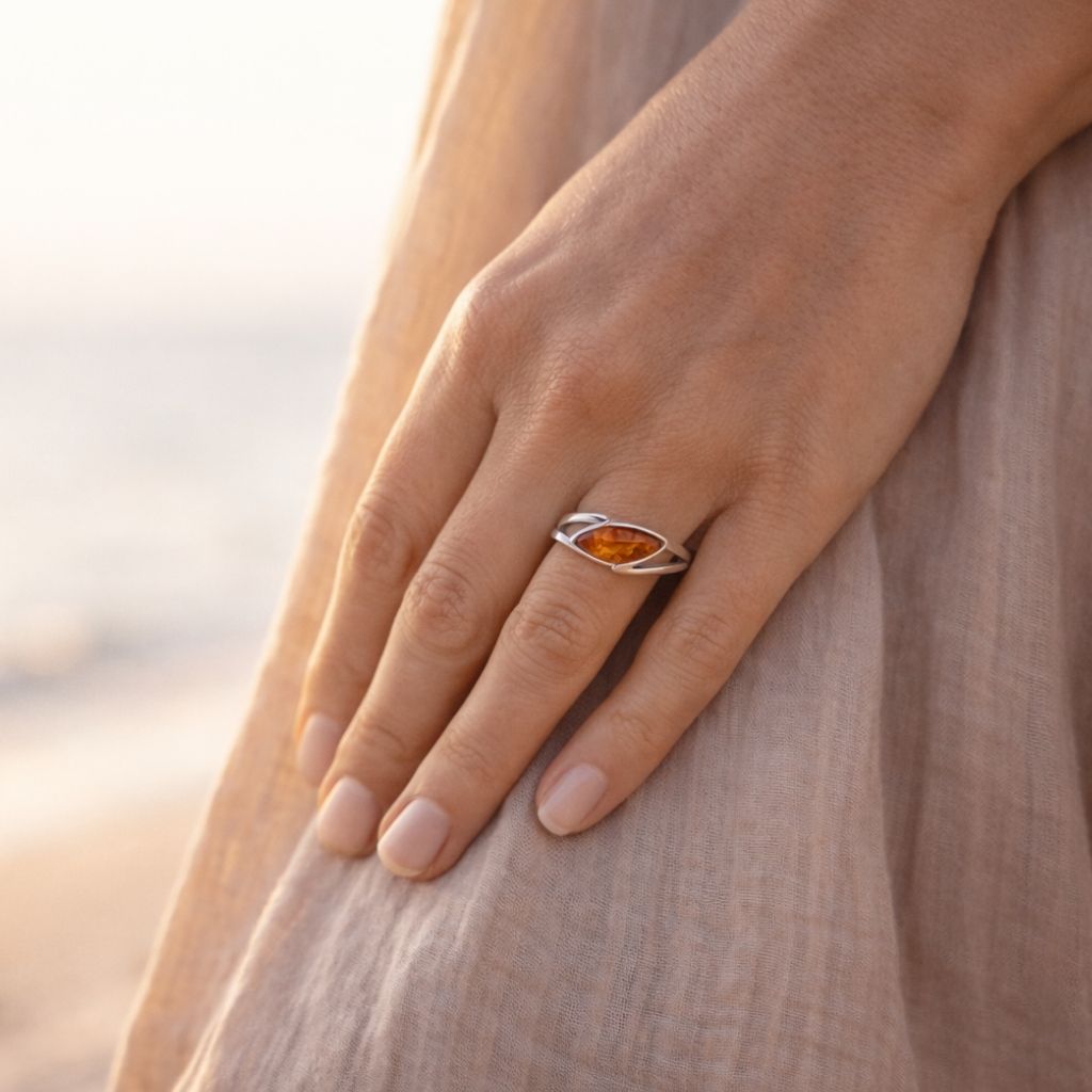 Die exklusive Kollektion „Natürliche Eleganz“ fängt mit dem Modell „Balans“ die beruhigende Atmosphäre der Ostsee perfekt ein. Dieser Ring Silber 925 rhodiniert Bernstein besticht durch seine längliche Form, welche Ihre Hand optisch sanft streckt. Da die Linien fließend gestaltet sind, erinnert das Design an die sanften Wellen am Strand von Usedom. Ein Silberring mit Ostseebernstein strahlt eine besondere Ruhe aus, weil Natur und Form hier im Einklang stehen. Zudem wirkt das Schmuckstück durch seine geschlossene Konstruktion sehr modern und bewahrt dennoch eine absolut zeitlose Ausstrahlung.