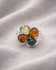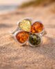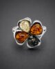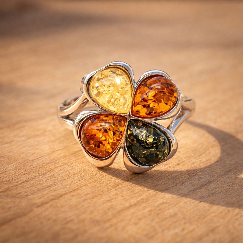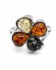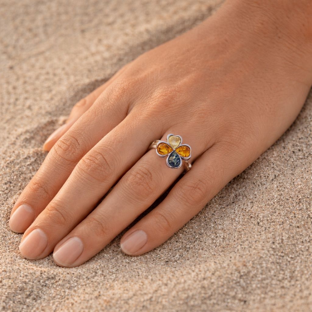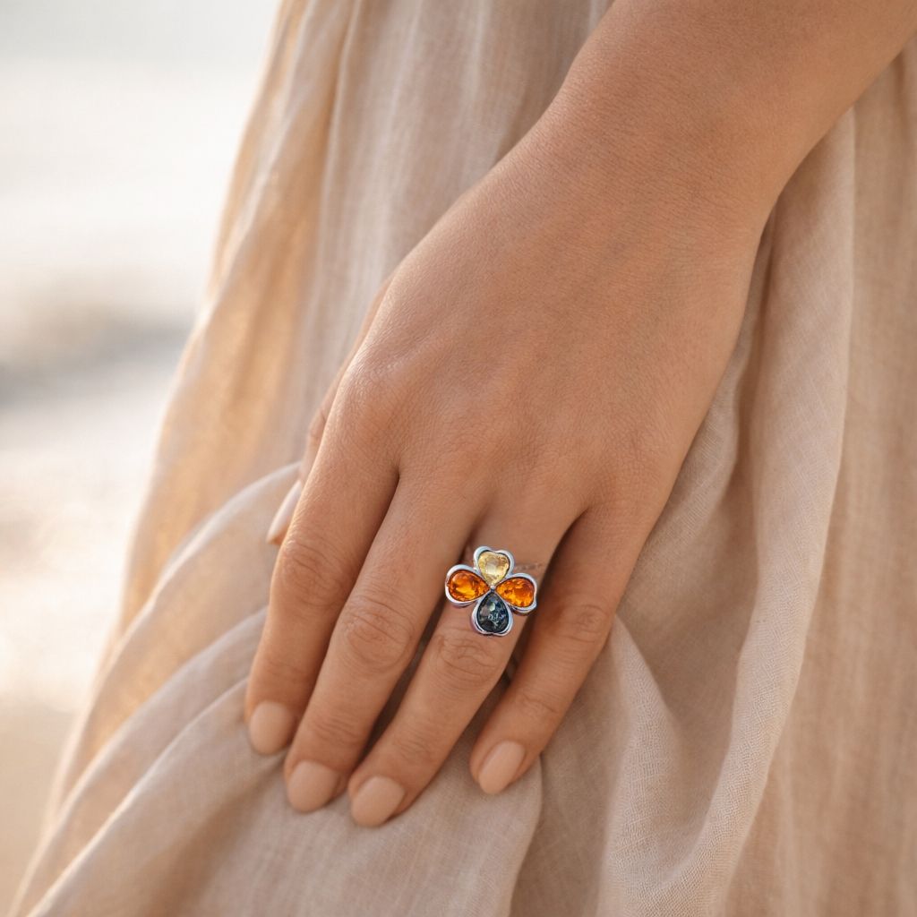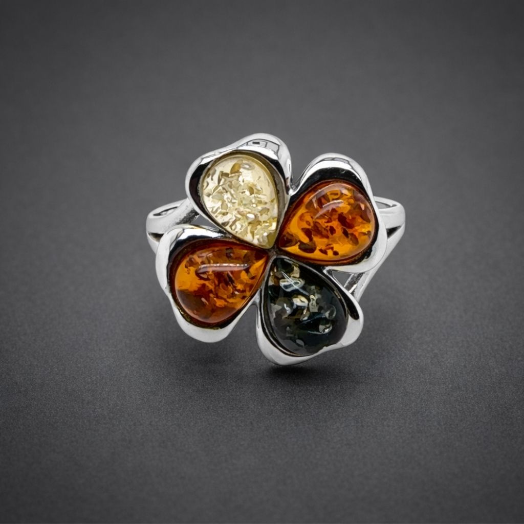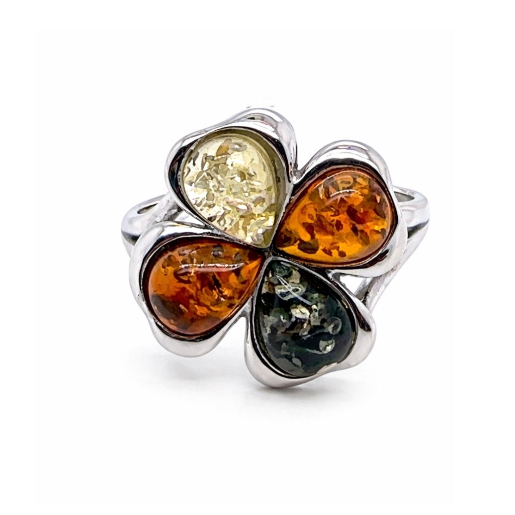 Glücksmoment der Natur: Exklusiver Ring Silber 925 rhodiniert Bernstein „Buntes Kleeblatt”