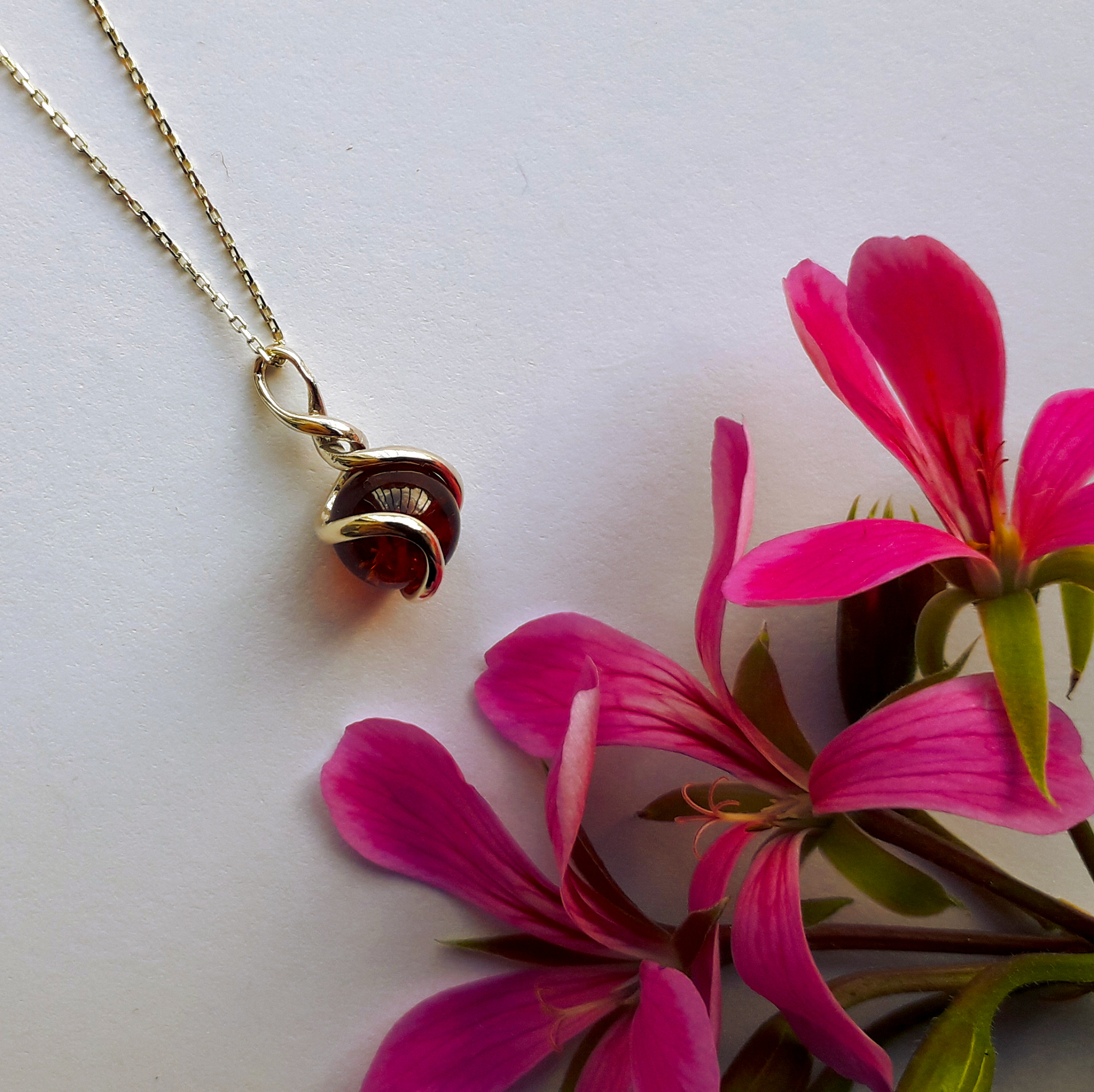 Eleganter und schöner Goldanhänger mit einer Bernsteinkugel. Die schöne Form des goldenen Rahmens verleiht ihm Charme, dieser Anhänger wird immer gut aussehen und ist perfekt für jeden Anlass.